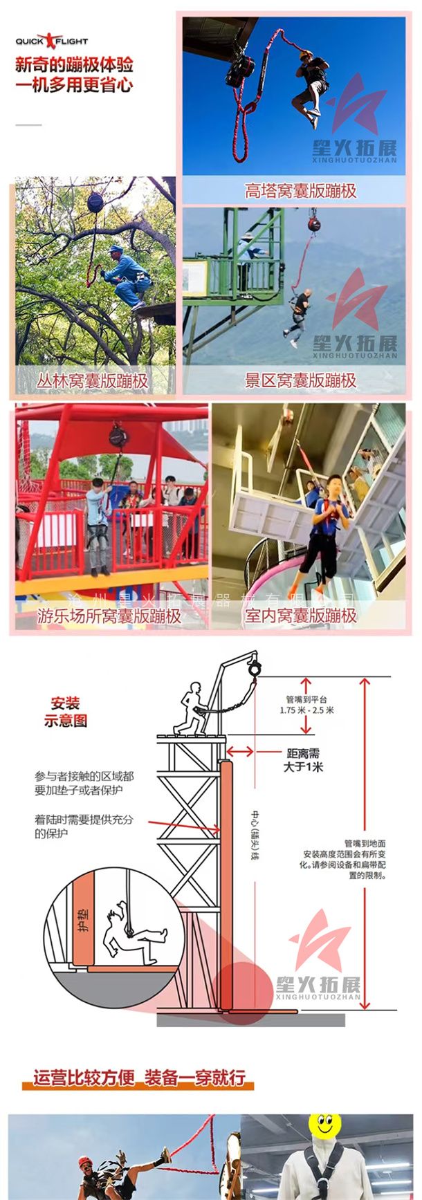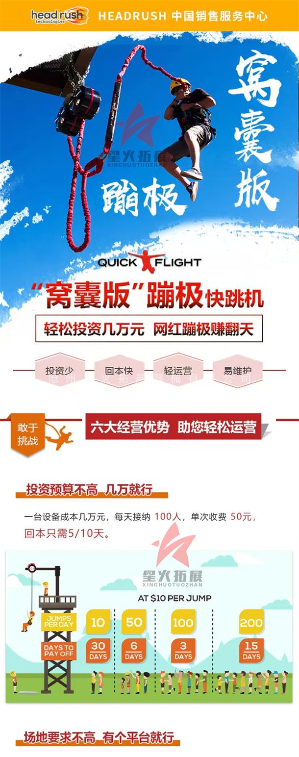 窩囊版“蹦極快跳機(jī):輕松投資幾萬元 網(wǎng)紅蹦極賺翻天,敢于挑戰(zhàn),投資少,回本快,輕運(yùn)營,易維護(hù)六大經(jīng)營優(yōu)勢 助您輕松運(yùn)營,投資預(yù)算不高 幾萬就行,一臺設(shè)備成本幾萬元,每天接納 100人,單次收費(fèi)50元,回本只需5/10天